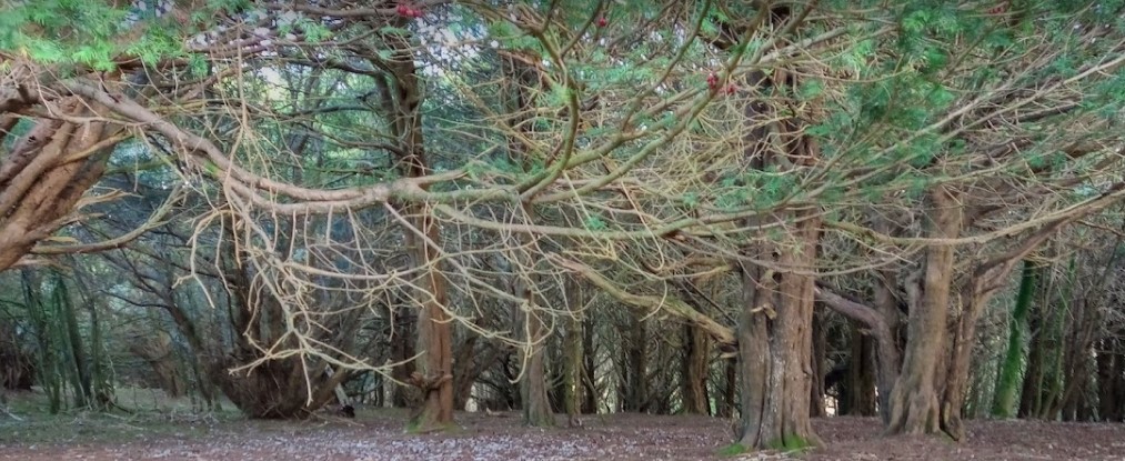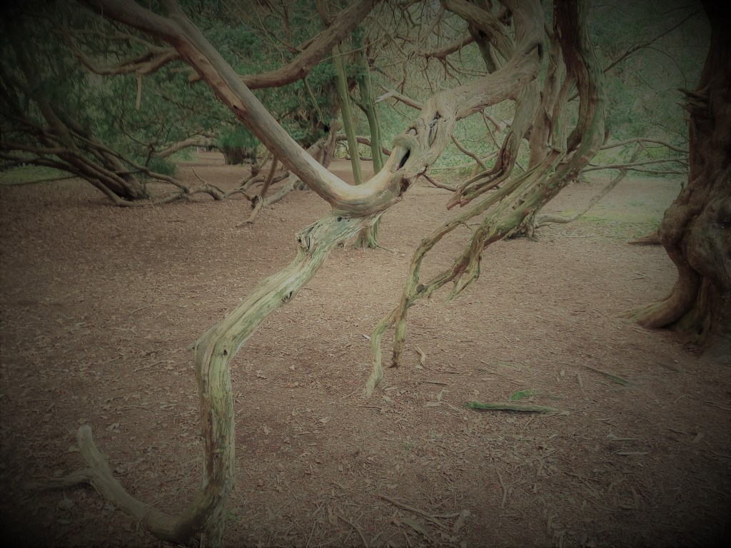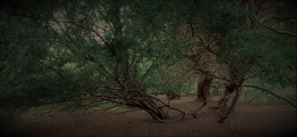 The yew trees in the top pictures are very old – maybe 1000 years old, so they might have been there in Nan and William’s time. They have grown into weird shapes. One day I walked through them when it was gloomy and misty – and definitely spooky.